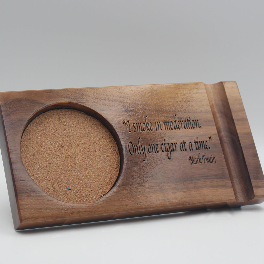 For the true cigar connoisseur, the Cigar Caddy is an essential accessory that elevates your smoking experience. Crafted from the finest American Black Walnut, this design accommodates your cigar and drink, allowing you to savor both in style wherever your cigar adventures take you. Its sturdy, elegant construction protects your cigar from rolling around while keeping your drink secure, making it the perfect companion for relaxing on the patio, entertaining guests, or exploring new cigar lounges. With the Cigar Caddy, you can indulge your passion for the finer things in life with unparalleled convenience and sophistication.